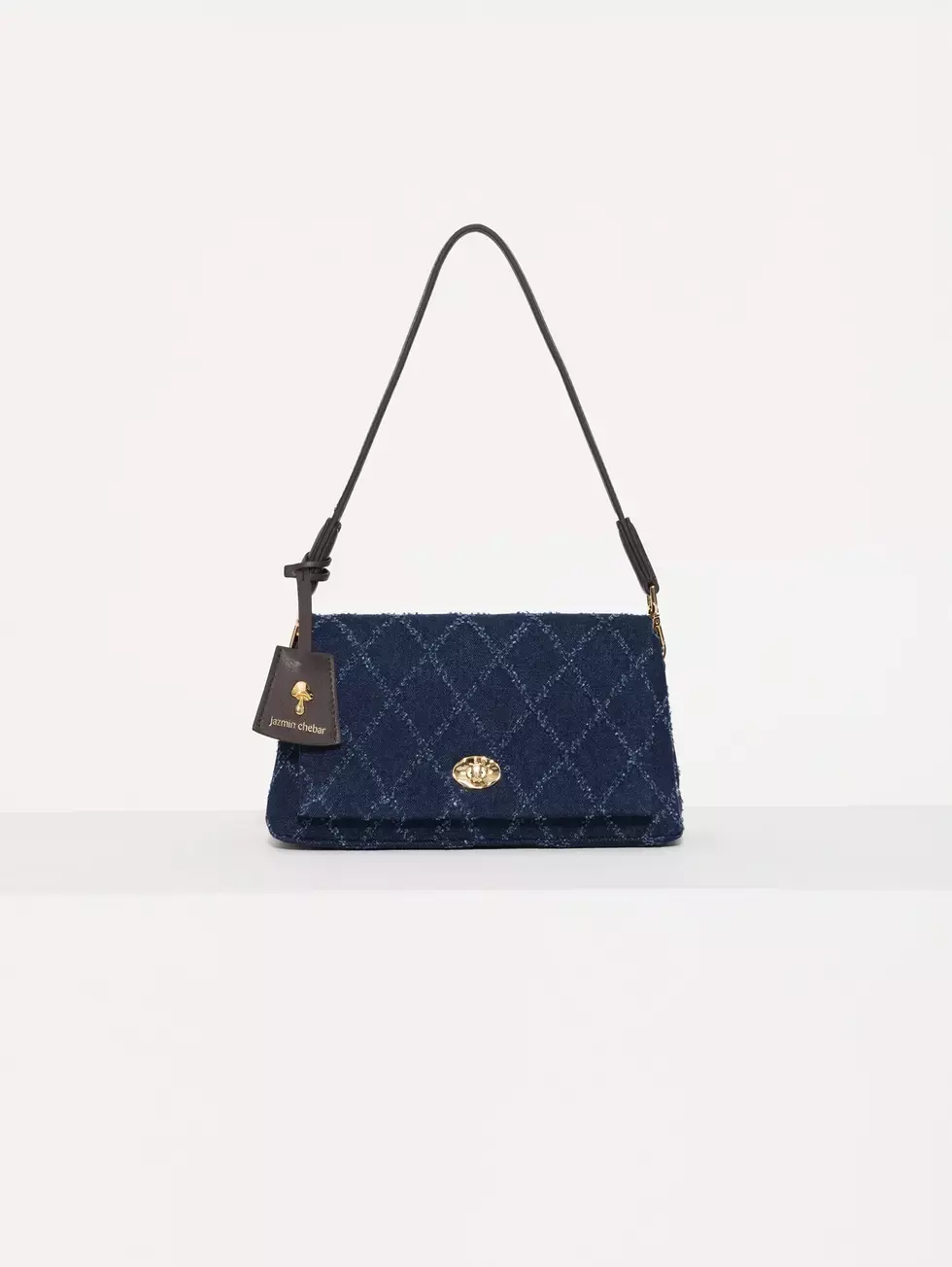 Bandolera Milan confeccionada en denim con acceso mediante torniquete metálico en el frente. Incluye un tag colgante con aplique de hongo que le suma un toque lúdico y distintivo. Cuenta con doble correa para mayor versatilidad de uso.