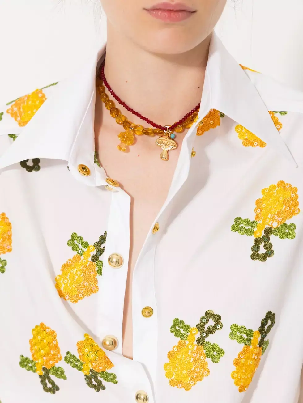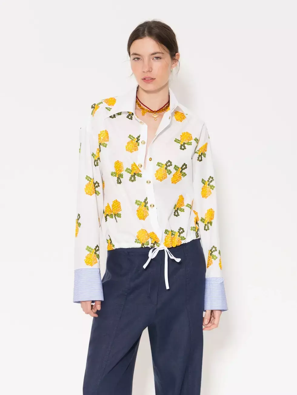 Camisa Citric confeccionada en poplin con bordado de limones. Incluye jareta en la cintura con lazo ajustable, broches dorados. Lleva detalles de vivos blancos y puños en poplin rayado con ajuste mediante ojal y botón forrado.