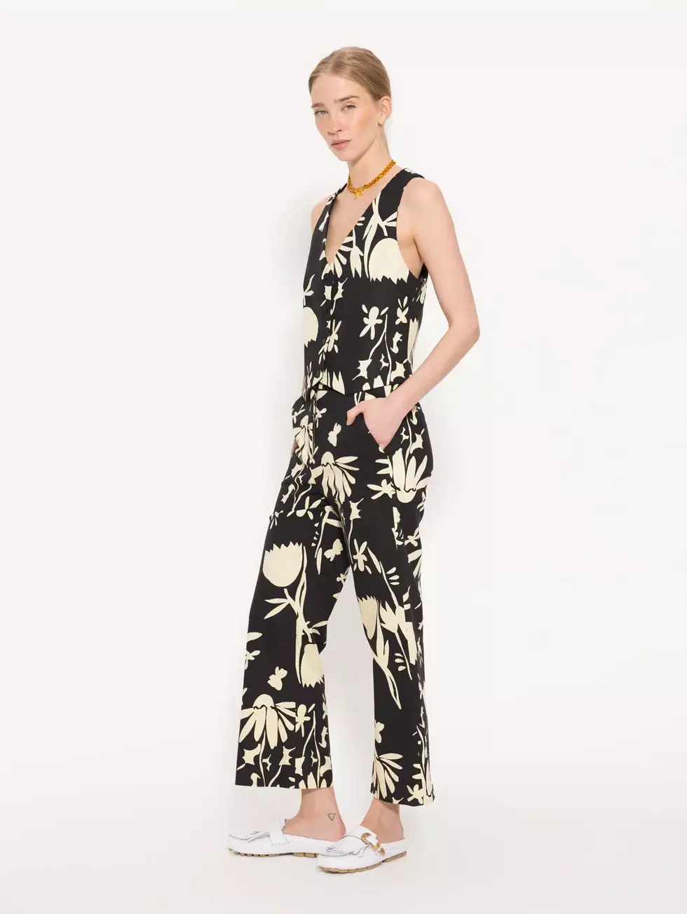Chaleco Cisnes con estampado exclusivo JCH. Escote en V, forrado con jacquard marcario negro. Su acceso es mediante cuatro broches chatos negros con logo.