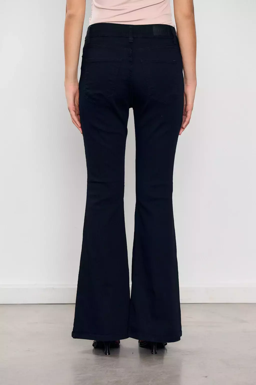 Jean elastizado, con corte flare. Lavado negro con siliconado, costuras a tono, color negro.