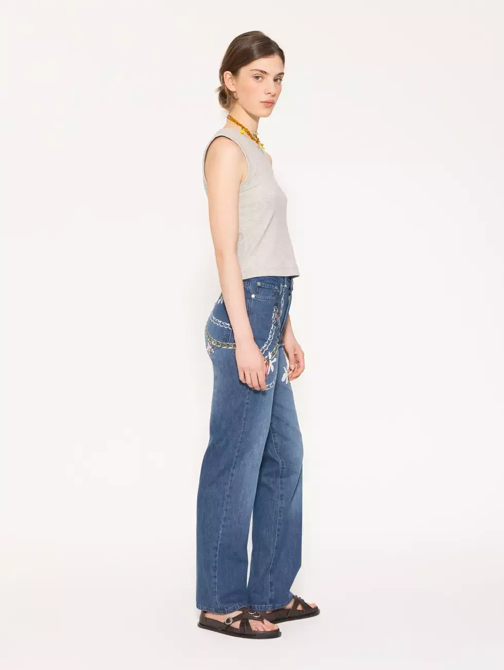 Jeans Straight Chilly de corte recto y tiro medio, confeccionados en un tejido liviano que combina algodón y lino, ideal para el verano. Su estampa exclusiva simula cadenas y charms diseñados especialmente para la colección.