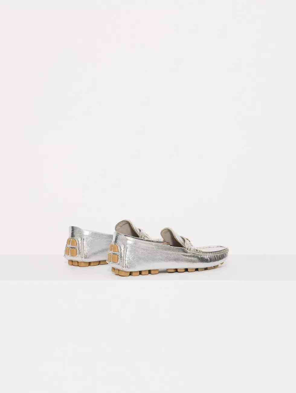 Mocasín Josefina realizado en colaboración con Guido, confeccionado en cuero vacuno flor con acabado metalizado. Incluye aplique metálico en forma de corazón sobre el frente. La suela es de goma.
