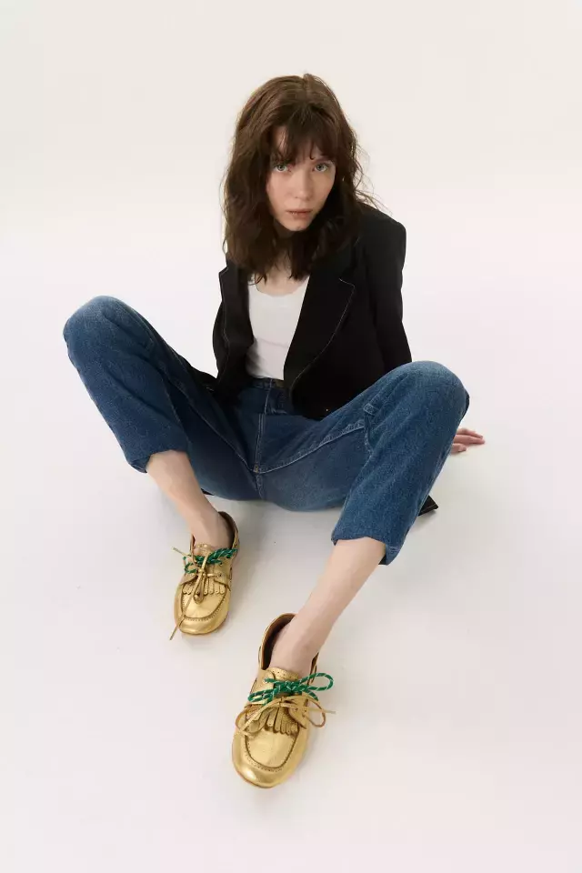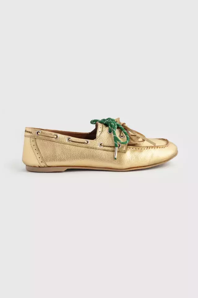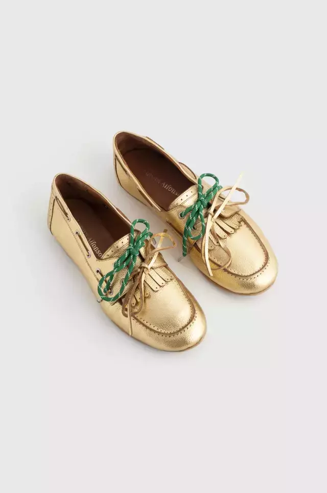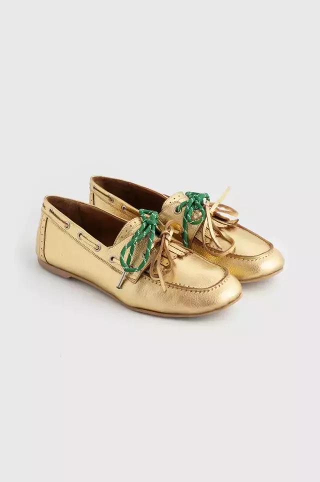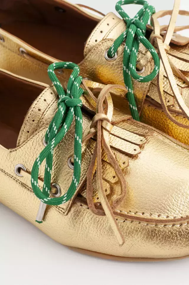DESCRIPCIÓN: Mocasines tipo náuticos fabricados con cuero dorado de alta calidad. Este modelo incluye dos pares de cordones intercambiables: uno de cuero dorado y otro de soga verde, permitiéndote personalizar tu estilo. La suela de goma asegura un agarre óptimo, mientras que la plantilla ultra cómoda garantiza confort durante todo el día.
