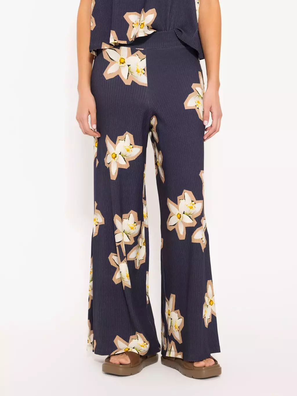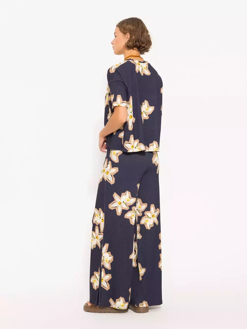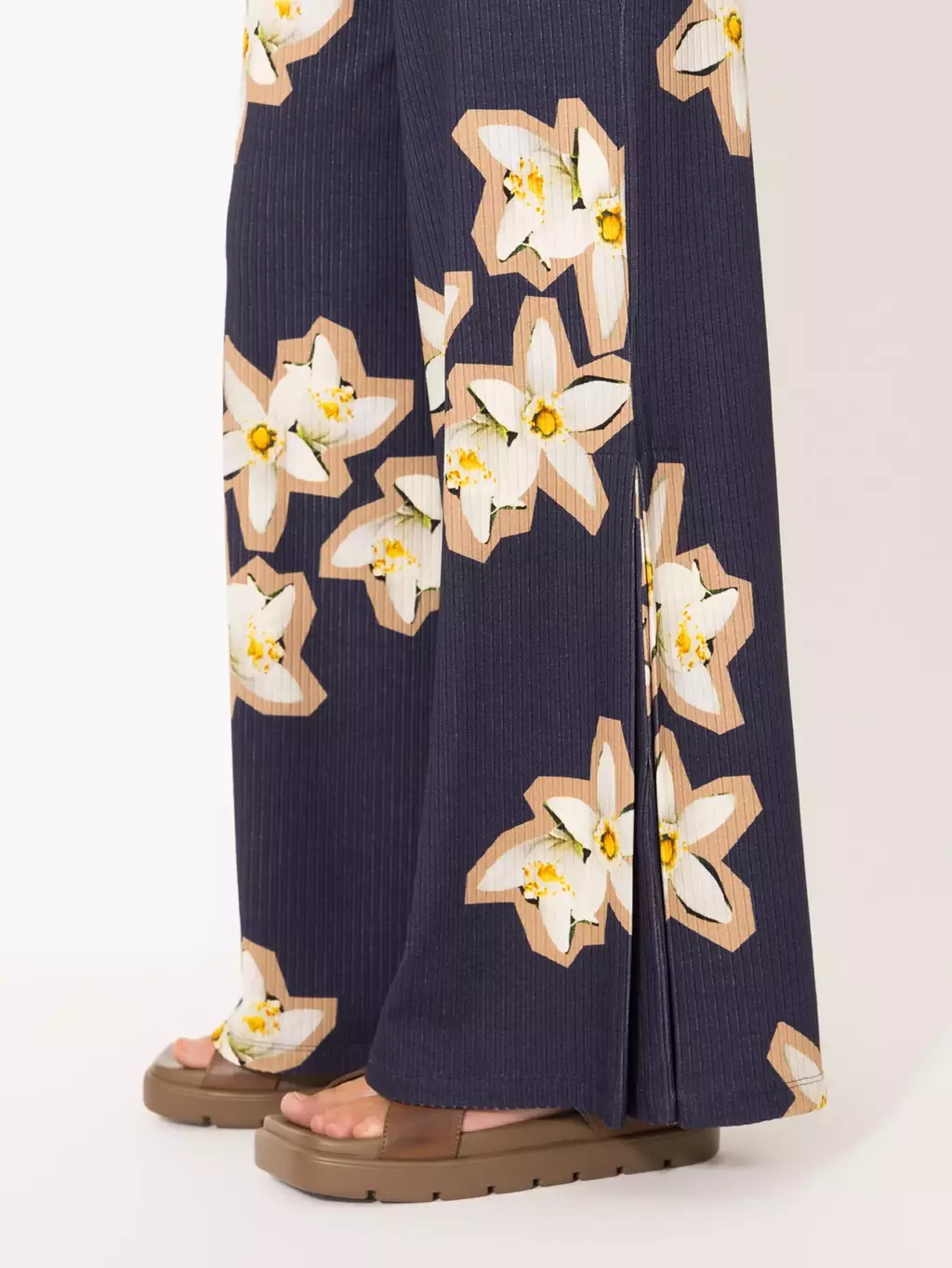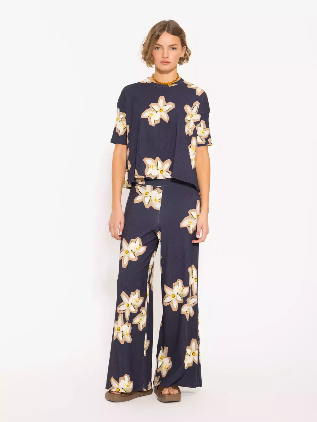 Pantalón Flower confeccionado en punto estampado full print. Con cintura elastizada y tablas en la botamanga que aportan amplitud y comodidad, es una prenda que combina frescura, diseño y un calce relajado.
