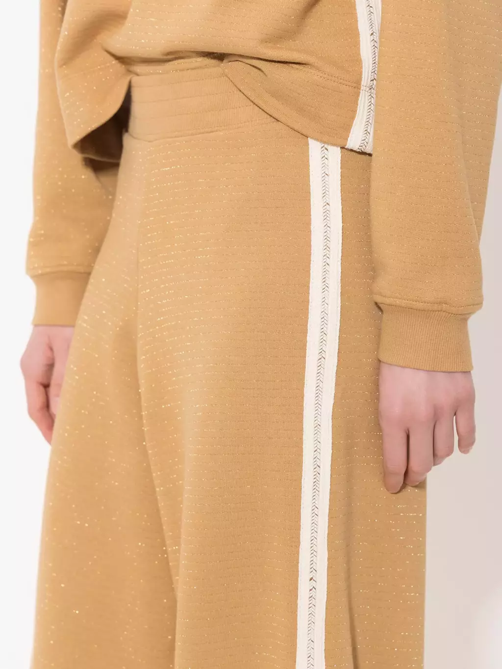 Pantalón Susi está confeccionado en tela de punto con lurex, lo que le da un brillo sutil y elegante. Lleva cintura elastizada para mayor comodidad y piernas amplias que crean un calce relajado y sofisticado.