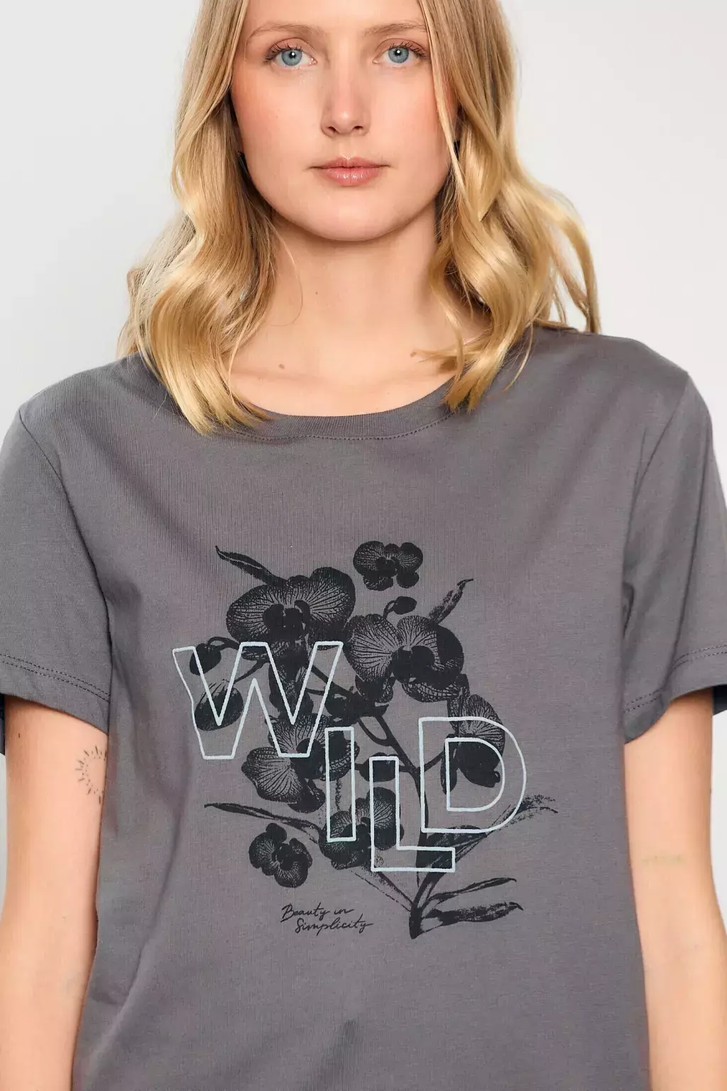 Su estampa central presenta un diseño botánico en tinta con detalle de la palabra "WILD" en puff, aportando textura y profundidad. Una pieza original y femenina que resalta por su estética delicada, perfecta para quienes buscan prendas con mensaje y estilo.