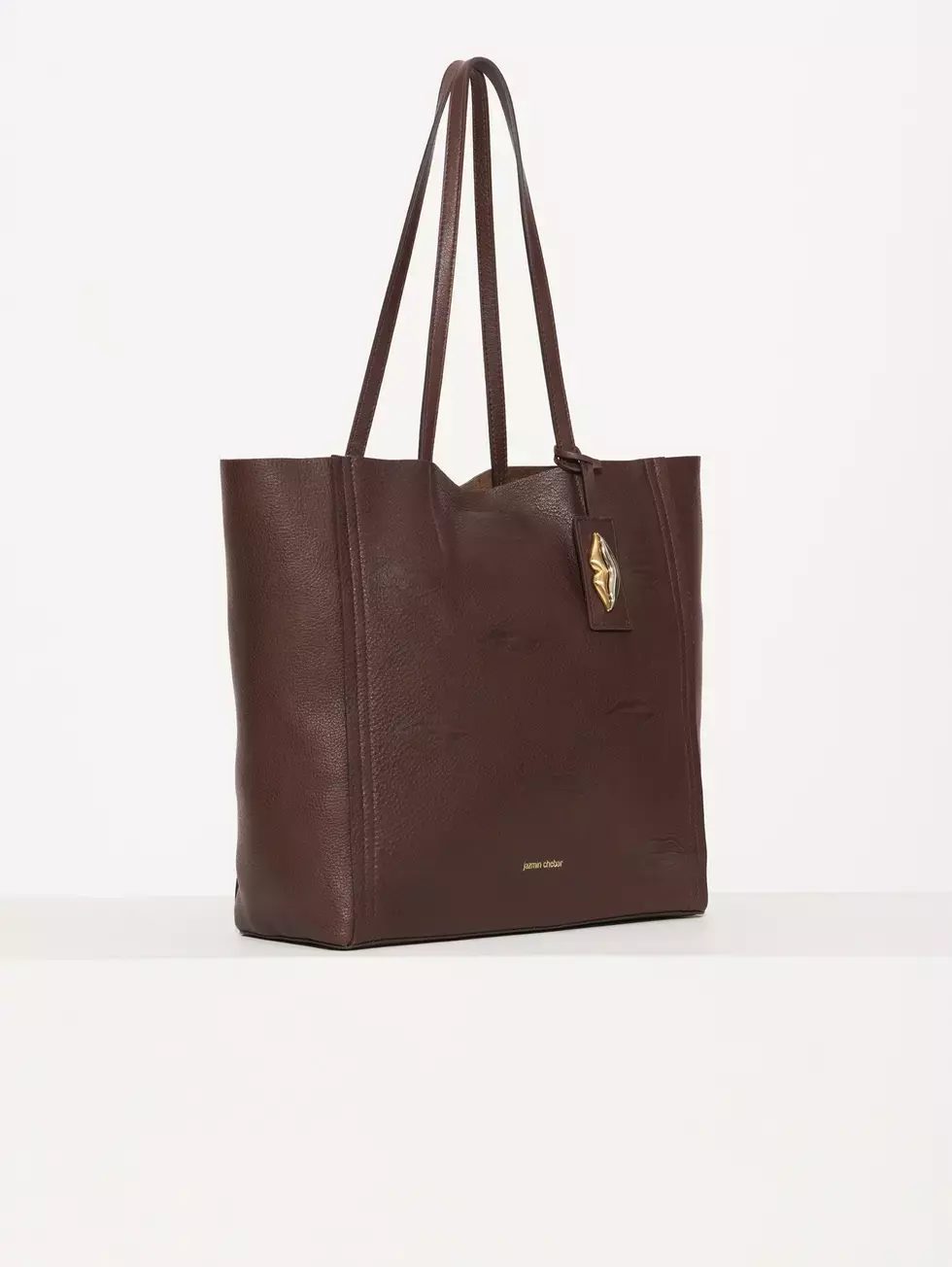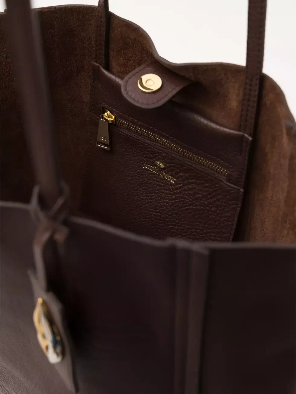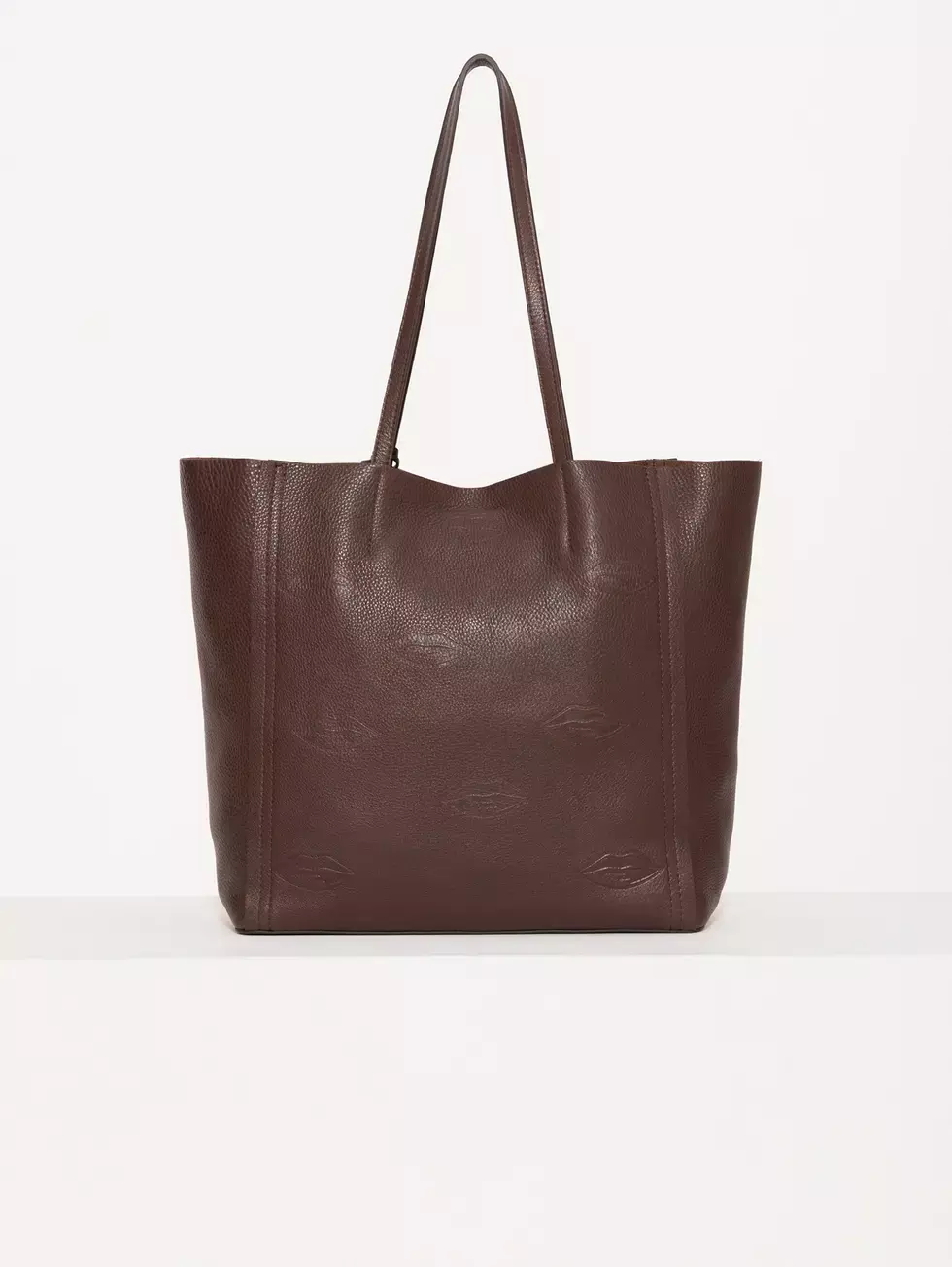 Shopper Kisses confeccionada en cuero vacuno liso, con diseño de kisses grabados en bajo relieve en todo el frente. Su acceso mediante imán y tiene un bolsillo interno con cierre. Lleva detalle de hang tag con aplique Lipstick bimetal.