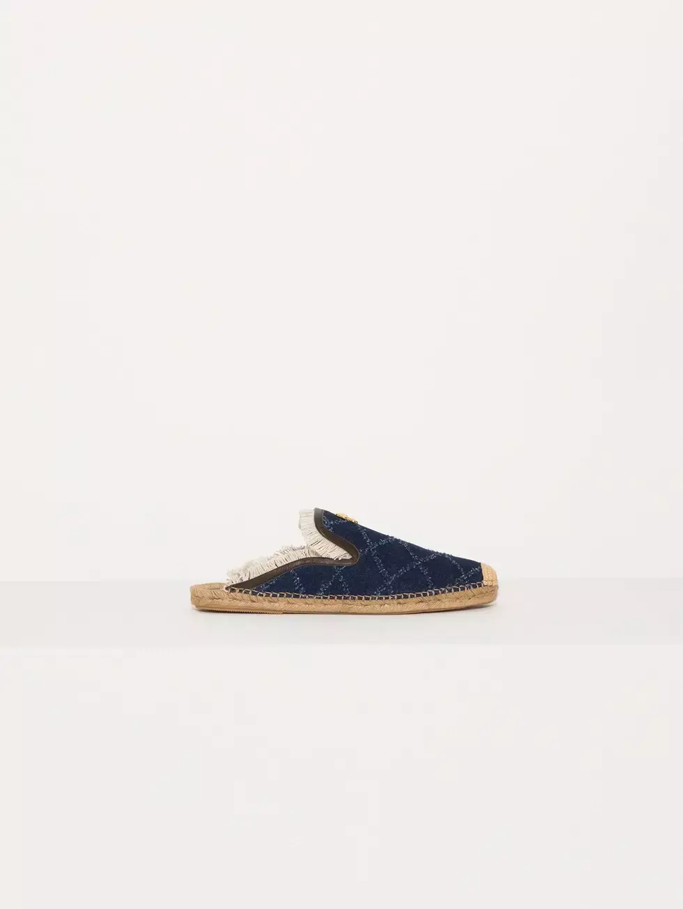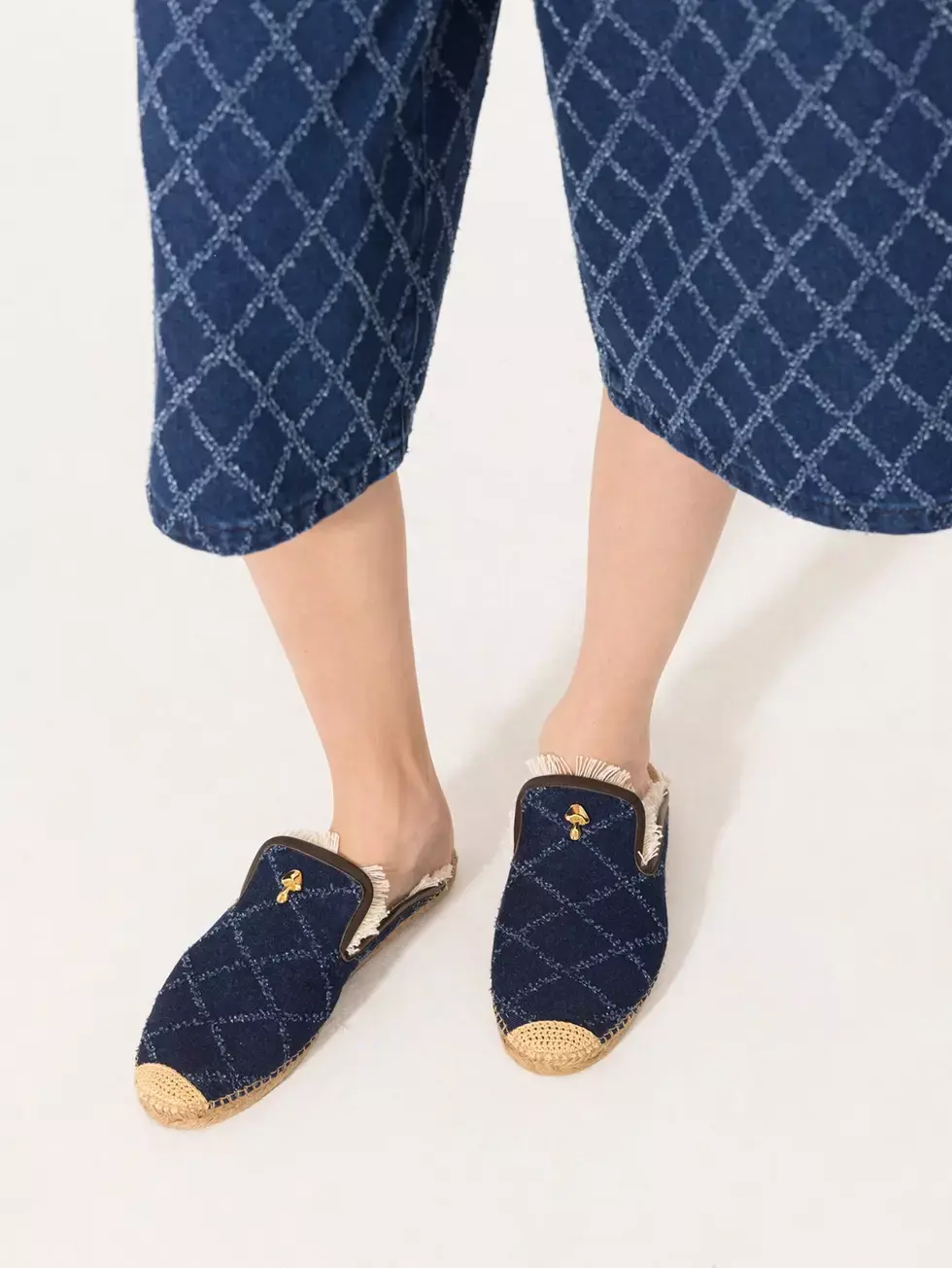 Slide Fantastic confeccionado en denim combinado con cuero vacuno liso. Destaca por el detalle de flecos y el aplique Groovy en el empeine. Su base trenzada en yute le da un aire rústico y artesanal, ideal para sumar textura y estilo a tus looks de verano.