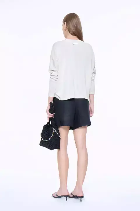 Sweater escote en V, de largo a la cadera y caída suelta.