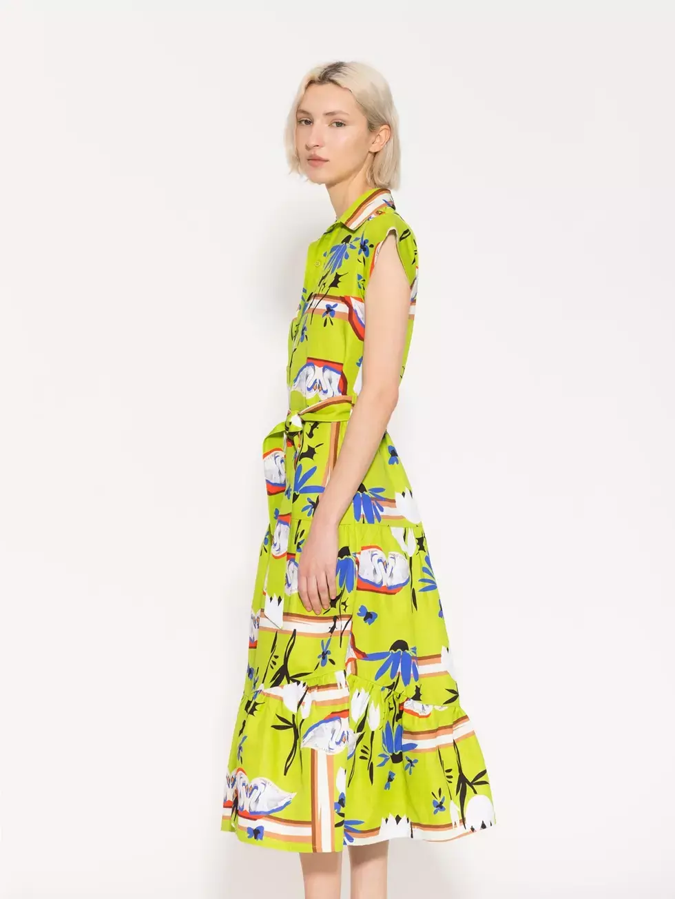 Vestido Cisnes estilo camisero confeccionado en tela ligera, su acceso es delantero mediante botones camiseros marcarios teñidos a tono de tela. Lleva un lazo de tela base en cintura para ajustar. Presenta bolsillos ocultos en laterales y dos recortes que le dan mayor amplitud a la falda.